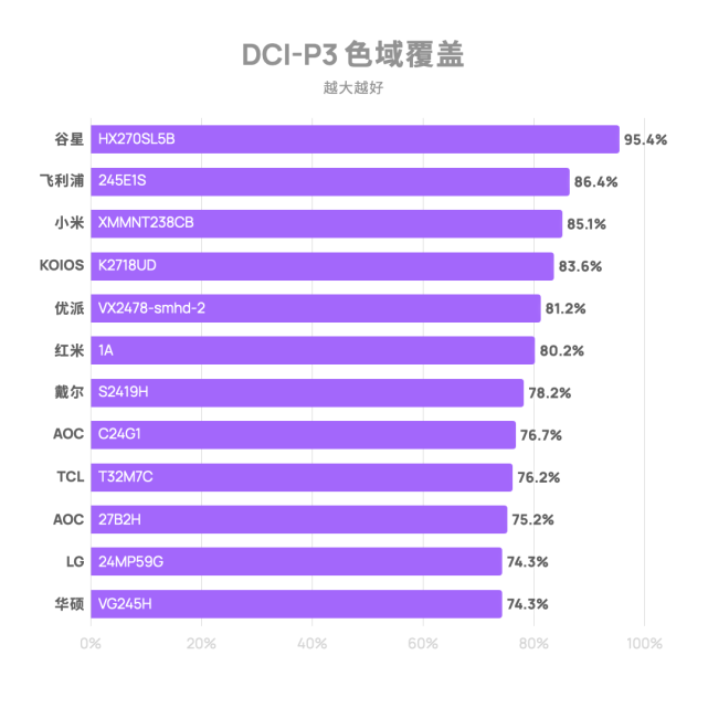 在色域和色准这一块,千元级别只要达到95%的SRGB色域即可。测试的显示器中大部分的色准符合我们的预期,日常使用没有问题。千元内也能买到P3色域的显示器,但是需要配合色彩管理使用。在购买的时候需要警惕色域容积和色域覆盖的区别,色域容积没意义,色域覆盖才有意义。像下图标注的就是色域容积,遇到类似情况要注意。