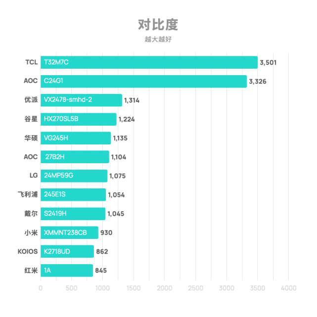 对比度方面,TCL和AOCC24G1是VA屏,比起一众IPS屏幕有先天的优势。