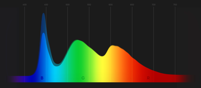 低蓝光我们在手机上见得多了,安卓厂商的护眼模式,苹果的夜览。低蓝光或者护眼模式从原理上来说大致会分成两种,第一种是简单粗暴地降低蓝光的总量,总的蓝光低了,那么有害蓝光的量自然会低了;第二种是改变屏幕结构甚至是发光材料的组成,移动蓝光在波谱中的位置,避开有害蓝光。