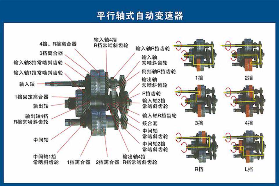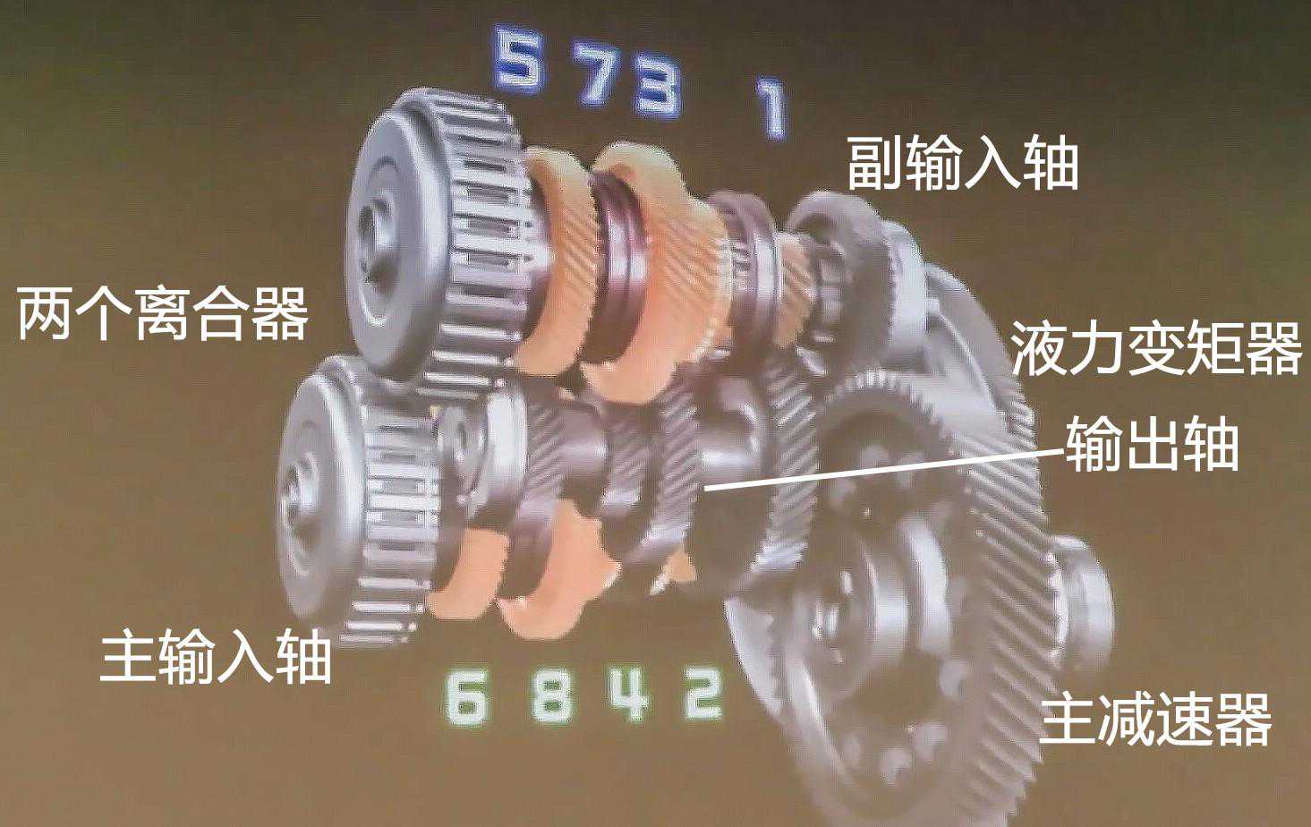 发动机动力,经过液力变矩器,传给主输入轴,再经过中间轴传给副输入轴,也就是说,两根输入轴都有动力输入。然后经过不同的同步器,将轴上动力传递给各档位齿轮,再经过挡位齿轮将动力传递给输出轴,最终将动力传递给车轮上。整个传力过程,与手动挡非常相似,不过是多了一根输入轴,分出了奇偶两组。