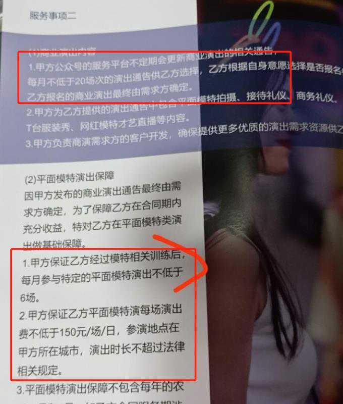 在韩素提供的《非职业模特服务合同》中可以看到,合同承诺,甲方(瑄玥模特公司)保证乙方经过模特相关训练后,每月参与特定的平面模特演出不低于6场,每场演出费不低于150元/场/日。此外,还约定,甲方每月在平台发布不低于20场演出通告。