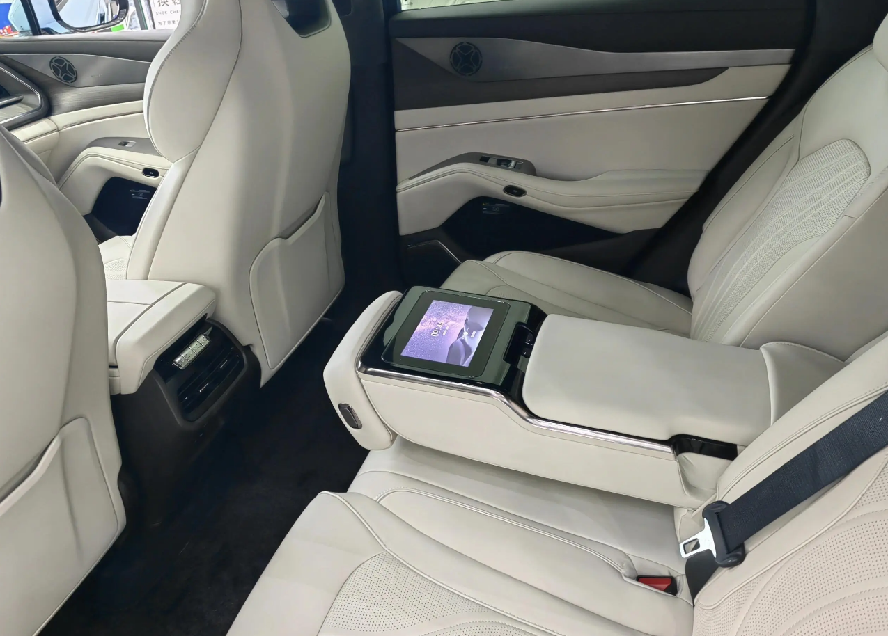 需要注意的是,新款腾势N7取消了中控台两侧的空调显示屏,后排扶手增加触控屏幕。在此基础上,还新增方向盘电动四向调节、流媒体内后视镜、外后视镜自动防眩目、后排座椅电动放倒等一系列配置。