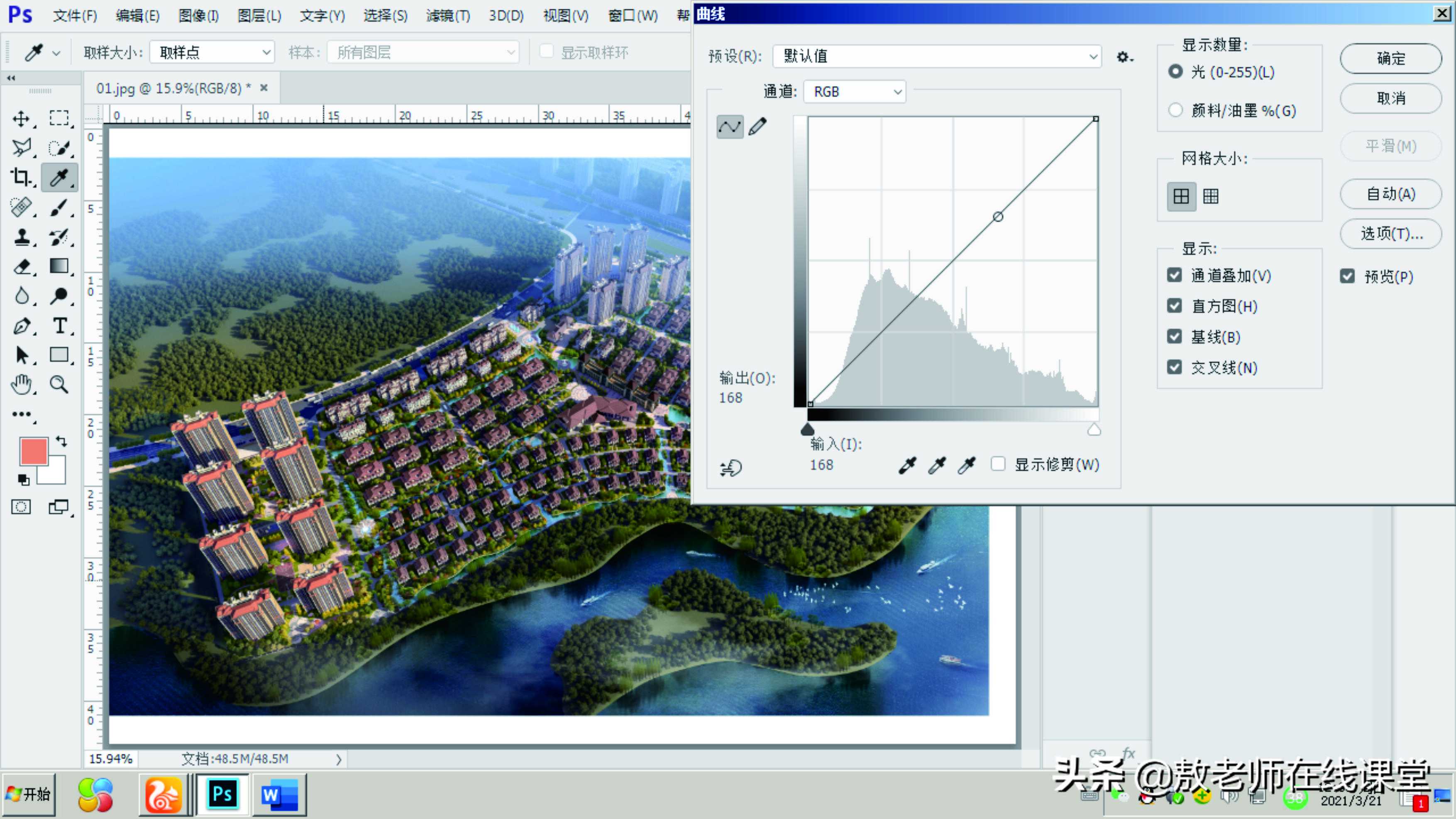 曲线:曲线最重要的一个功能就是用来调节整个图像任意局部的亮度,使其在亮度上与整个图像的亮度保持协调。