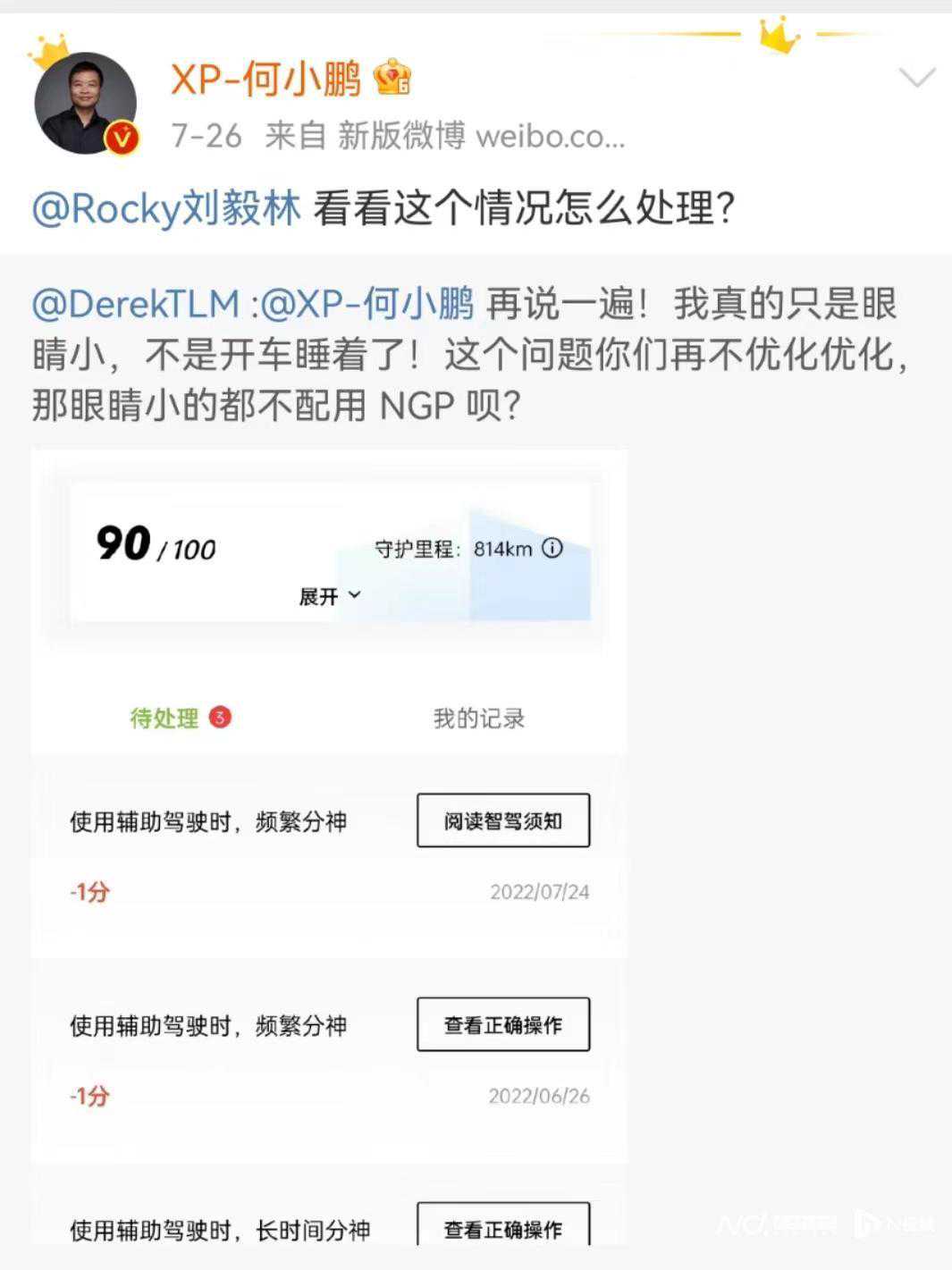 7月25日,@DerekTLM发博称,“再说一遍!我真的只是眼睛小,不是开车睡着了!这个问题你们再不优化优化,那眼睛小的都不配用NGP(智能导航辅助驾驶)呗?”26日,小鹏汽车董事长何小鹏转发了这条微博并要求技术人员处理。