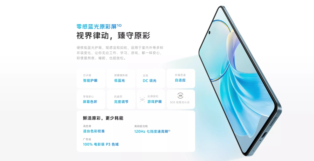 屏幕方面,vivoY100t手机配备了一块6.64英寸LCD显示屏,分辨率为2388×1080,具有394PPI、1500:1对比度、100%电影级P3色域,支持120Hz刷新率。同时,该屏幕支持硬件级低蓝光、全局DC调光、环境色温自适应,通过SGS低蓝光认证。