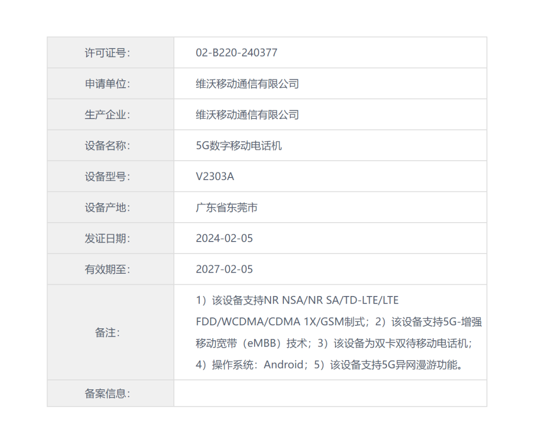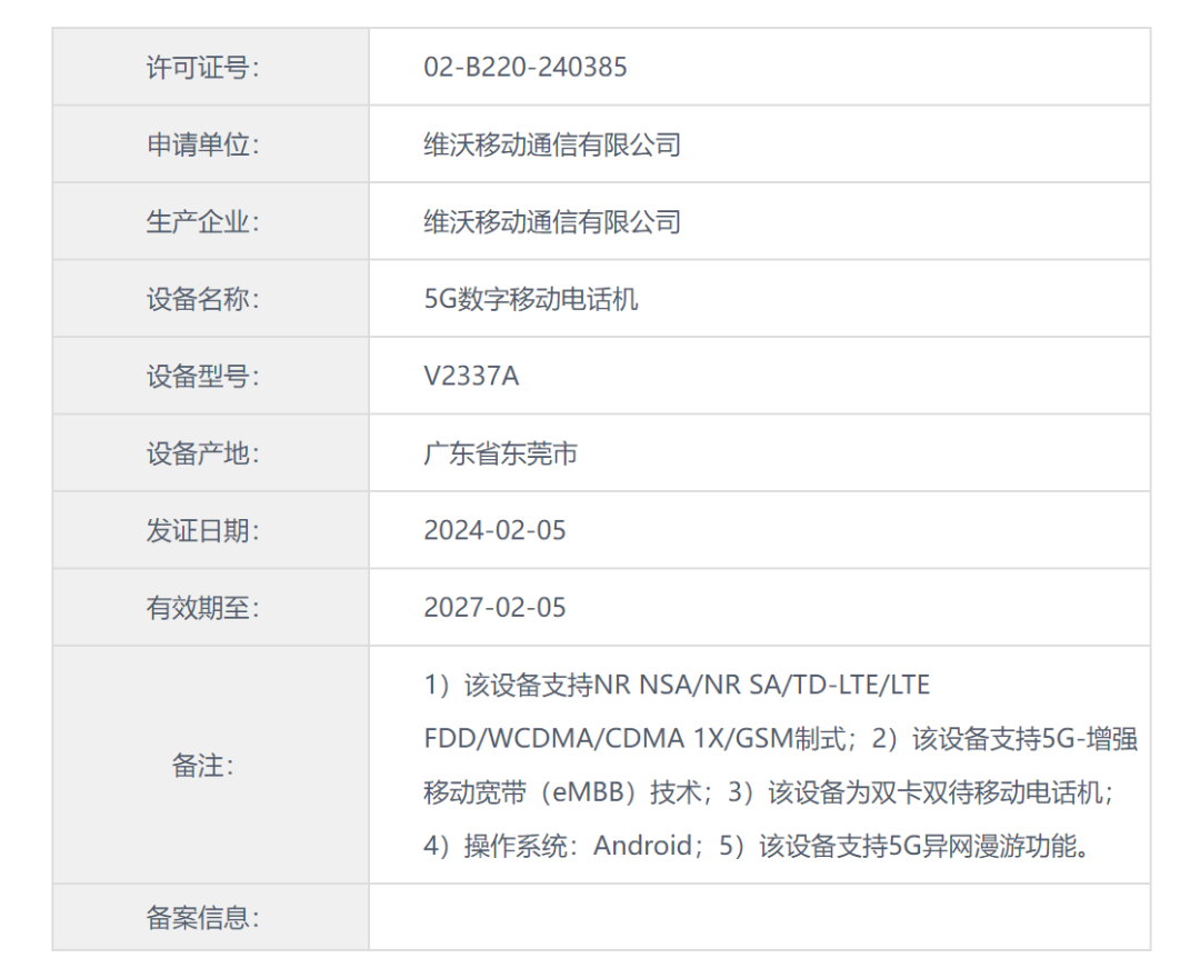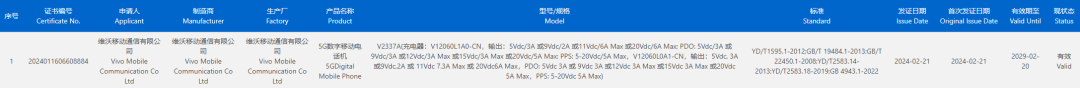 认证信息显示,该手机随机附赠V12060L1A0-CN/V12060L0A1-CN120W充电器。