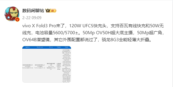 同时,据数码博主@数码闲聊站的一份爆料中提到,vivoXFold3Pro配备120WUFCS快充头,支持百瓦有线快充和50W无线充,电池容量为5600/5700±。新机还将搭载5000万像素OV50H超大底主摄+5000万像素超广角+OV64B潜望镜头,号称“骁龙8G3全能轻薄大折叠”。