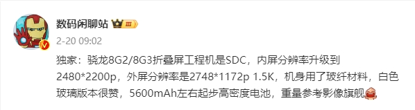 另外,结合该博主此前的爆料来看,vivoXFold3/Pro折叠屏手机分别搭载骁龙8Gen2/8Gen3处理器,工程机采用三星SDC屏幕,内屏分辨率升级到2480x2200,外屏分辨率为2748x1172,机身采用了玻璃纤维材料,提供白色玻璃版本,内置5600mAh左右起步高密度电池。