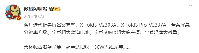除了vivoY系列手机外,vivo有望在3月发布折叠屏新旗舰——vivoXFold3系列折叠屏手机。