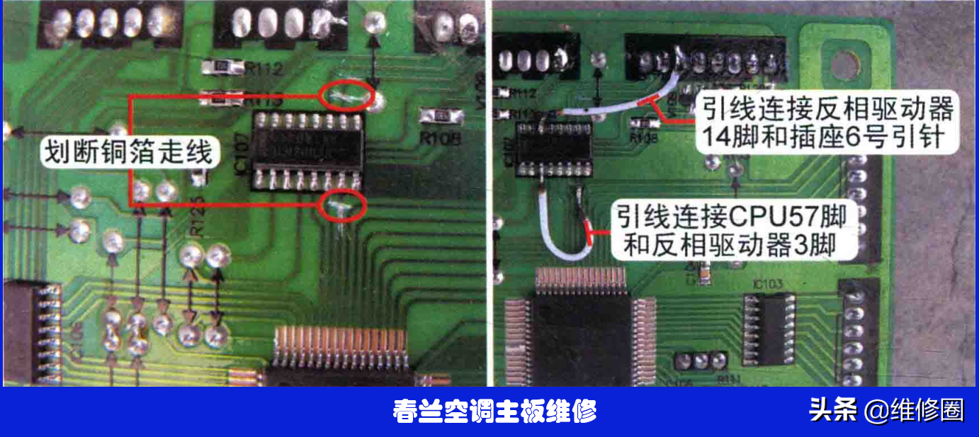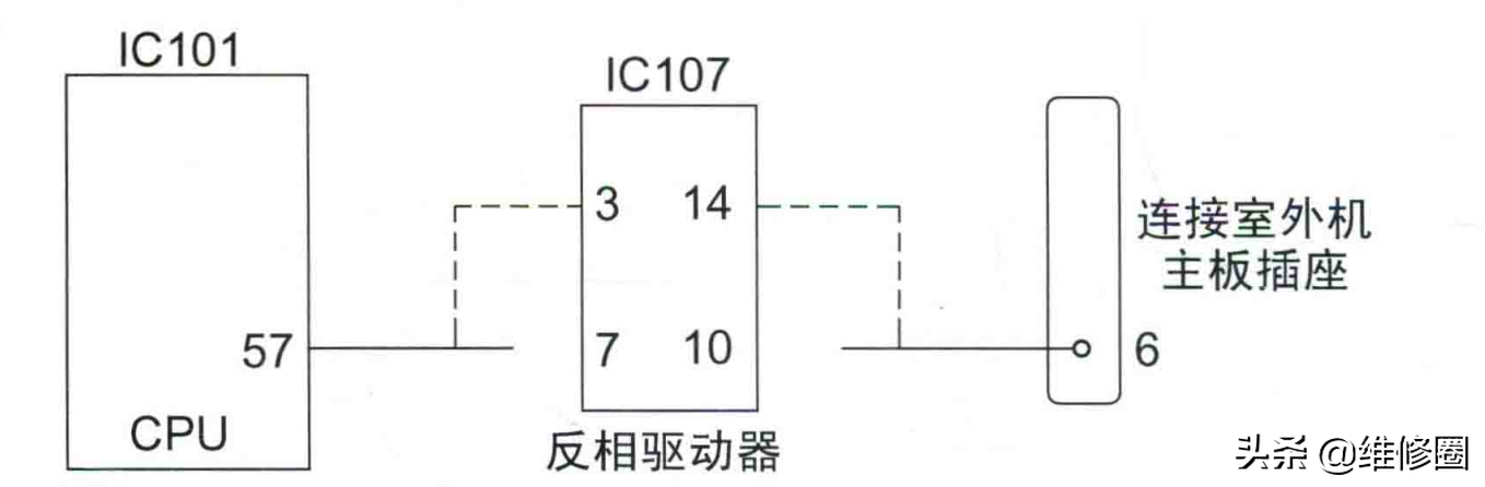 代换方法见图4,将⑦脚和脚与主板连接的铜箔走线划断,使其脱离电路,使用一根弓|线连接CPU的⑤脚和反相驱动器的③脚,再使用一根弓|线连接反相驱动器④脚和插座的6号引针。改好线路后上电试机,压缩机运行,制冷恢复正常。