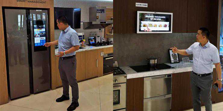 以海尔的招牌产品冰箱为例,较为明显的是冰箱门上添加了一块大屏,在现场演示过程中,这块大屏除了具有如手机一样的影音、购物、留言板、家庭相册、语音交互等功能,主推功能则是加入了智能菜谱。具体包括通过智能配菜选项,手动添加冰箱中已有食材,系统根据食材自动推荐可以做的菜及具体步骤、方法。这一功能同样被应用于海尔旗下高端品牌卡萨帝厨房解决方案中的交互大屏。
