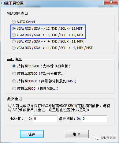 为了使用方便,转接线在批量制作时,VGA端口一侧选择使用12、15,这样在编程器软件界面上点“参数设置”时,选择下图蓝色框中的两个选项之一后保存,若一个不行,则选择另一个(相当于调换RX、TX线)保存后,继续其他操作。