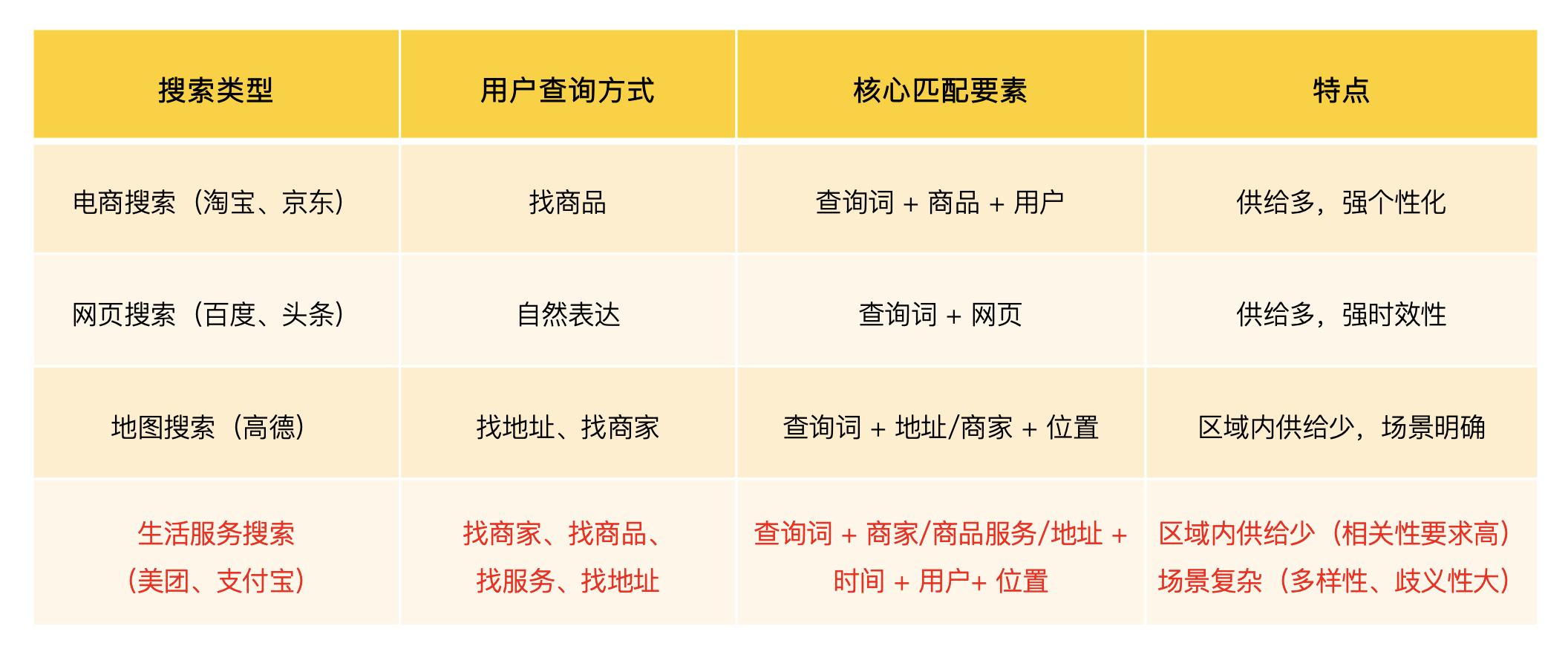 搜索是在用户搜索词以及供给两方面约束下尽可能提高用户触达效率以及商业化指标,而美团的搜索场景增加了“地域”第三个约束。具体的行业对比如下图所示: