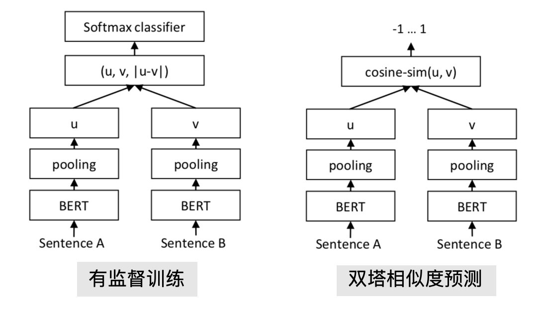 我们实践的方法基本与Sentence-BERT思想大致相同,使用下图中左图的方法构造有监督的改写对训练数据,用右图的方法在不同意图类型的历史搜索Query进行向量计算。