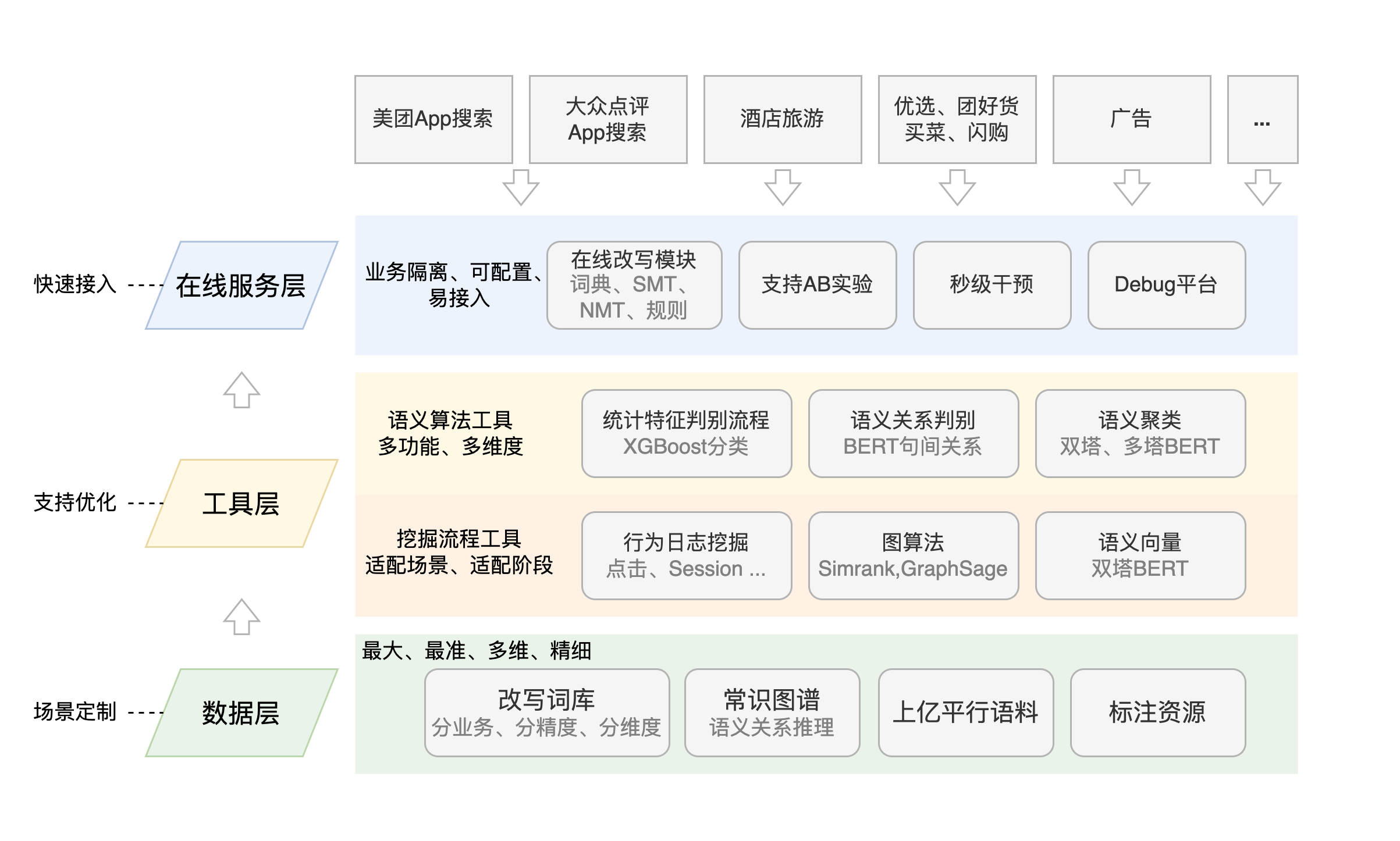 查询改写项目经过上述介绍的迭代,在美团搜索不同发展时期均贡献了不错的业务收益。并且随着技术影响力的扩大,逐步与大众点评App搜索、外卖App搜索、搜索广告等业务方建立了合作,在美团搜索的商品、外卖、酒店旅游等业务沉淀了相应的数据和技术能力。与此同时,各业务也根据自身的发展阶段和业务特点对查询改写提出了一些独有的需求,对此我们把查询改写的核心功能做了抽象,整个技术框架的发展方向为: